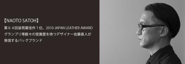 ブランド名でもあるデザイナー佐藤直人氏は、第64回装苑賞佳作第一位受賞。コシノジュンコ氏に師事し、 JAPAN LEATHER AWARD 2010 グランプリ受賞及び同 2012・2013 メンズバッグ部門賞を受賞するなど、気鋭のデザイナーとして注目を浴びています。25年以上に展開しているネオプレンバッグに、最近では牛革とネオプレン素材を張り合わせたネオプレンレザーの開発に成功し、裏地と縫い代の無いウエットスーツ縫製を駆使した軽量で立体感のあるデザインを展開中。世界的な日本のデザイナーズブランドのバッグデザインも手がけています。