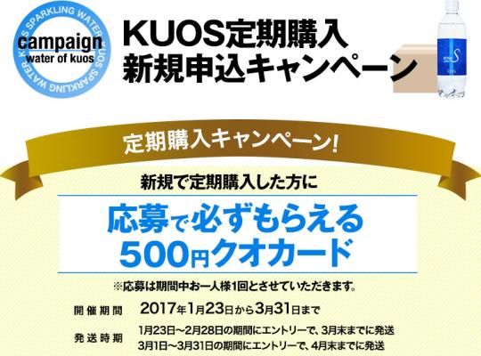 株式会社OTOGINO(オトギノ:社長 鬼武公洋 本社 大分県日田市北友田 2 丁目 2123 番地 1)が販売している、うまさを感じる強炭酸水『KUOS-クオス-』の定期購入を、新規でお申し込み頂いた方全員に500円クオカードプレゼントキャンペーン開催中です。(開催期間:2017年1月23日~2017年3月31日まで)
