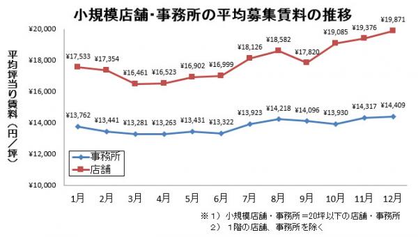 小規模店舗(20坪以下)の12月度平均募集賃料は、前月から2.6%上昇しました。