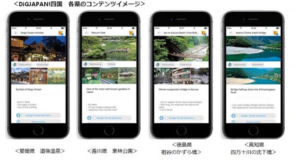 今回、「DiGJAPAN!」アプリの新しいエリアとして追加された四国では、香川県の栗林公園、愛媛県の道後温泉、徳島県の祖谷渓、高知県の四万十川などをはじめとして、歴史、文化、美しい自然など、近年個人旅行をする訪日外国人が求める「日本でしか出会えないもの」を数多く紹介しています。