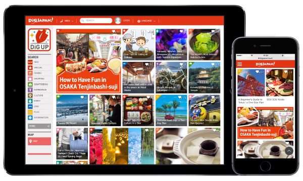 「DiGJAPAN!」は、当社のインバウンド事業における訪日外国人観光客向けサービスブランドで、英語、韓国語、繁体字中国語、簡体字中国語、タイ語、日本語など多言語に対応し、アプリやWEBサイト、BtoBサービスなど幅広く展開しています。無料の訪日外国人観光客向けのスマートフォンアプリ「DiGJAPAN!」は現在60万ダウンロードを突破。DiGJAPAN!WEBサイトは月間50万ユーザー、各国向けのFacebook、WeChat、NAVERは全世界で約88万人のファンを集めており、外国人旅行者に人気の訪日インバウンド専門メディアです。