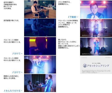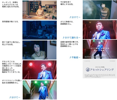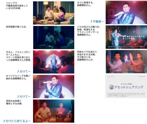 [アセットシェアリング]は、良質な不動産を、一口100万円単位で5口以上から購入いただける資産商品で、相続や贈与に関心が高い50~70代のお客様に最も多くご購入いただいておりますが、さらに多くの方に本商品に興味を持っていただきたいという想いから、“不動産はシェアして持てる”ことを西郷輝彦さんのコミカルな動きと歌声でお伝えしています。