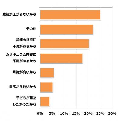 転塾を考えた理由としては、「成績が上がらないから」が最も多く25%、次に「その他」が22%、「講師の指導に不満があるから」が20%、「カリキュラム内容に不満があるから」が18%でした。塾に通う上で、「成績が上がるかどうか」ということは最も重要であることが分かります。
