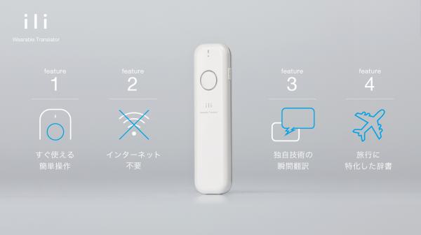 ウェアラブル翻訳デバイス「ili(イリー)」は、インターネットやスマートフォンとの接続が不要なスタンドアローン型音声翻訳デバイスです。フュートレックの音声認識・機械翻訳技術が搭載されており、日本語、中国語、英語に対応しています。
