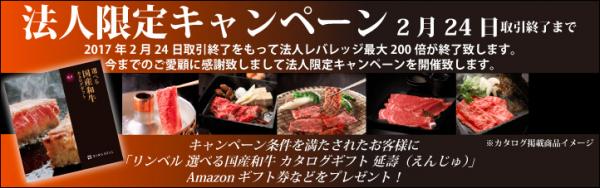 FX取引サービスを提供する外為ファイネスト株式会社(本社:東京都千代田区、代表取締役:石野由美子)は、2017年2月1日より、取引条件クリアでもれなく「Amazonギフト券」(最大5,000円分)、さらにエントリーした法人のお客様全員の中から抽選で10名様に「リンベル 選べる国産和牛 カタログギフト 延壽(えんじゅ)」をプレゼントする『法人限定キャンペーン』を開催中です。