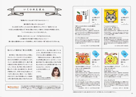 ガイドブックには、絵本の内容紹介はもちろんのこと、絵本ナビ会員のユーザーレビューや対象年齢も掲載しております。「もう読んだ?」というチェック欄や、読んだ日付を記入する欄もついており、お子様との楽しい読書の記録にもなります。また巻頭には、日本チャイルドボディケア協会代表の蛯原英里さんより「絵本と子育て」をテーマにいただいたメッセージを掲載しております。