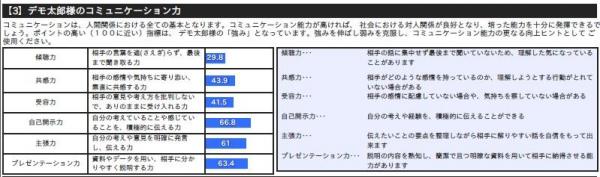 ●企業経営者、人事採用担当者が自社従業員に求めるスキルに必ず挙がってくる能力である「コミュニケーション力」と「問題解決力」がそれぞれのスキルで下記の様に詳細に、結果が数値で表されられます。
