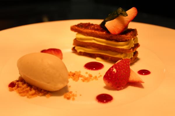 福岡県産博多あまおうを使ったミルフィーユ バジル風味、オリーブオイルのアイスクリーム