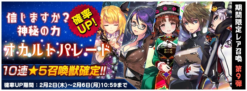 期間限定レア召喚「オカルトバレード」を期間限定確率アップで開催いたします。