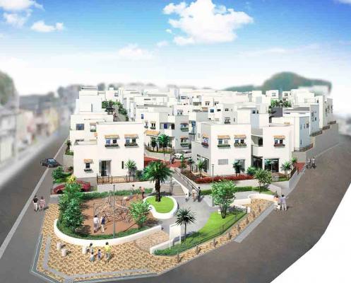 スペインのアンダルシア地方の町「フリヒリアナ」を感じさせる、白く美しい街としてさまざまな工夫が施されています。緩やかな南ひな壇を形成する分譲地内は、多彩な植栽が街を彩り、街全体に陽光が降り注ぐ立地特性を実現しています。晴れた日には、白い壁と青い空のコントラストにより見事な光景を浮かび上がらせる街並みを計画しています。また、全棟認定低炭素住宅とすることにより、機能的にも人と環境にやさしい街づくりをしています。