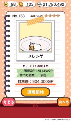 本キャンペーン期間中にゲーム内で調理器具「なべ」の3時間30分レシピで作ることができる『メレンゲ』を一番多く作った方から抽選で上位10名様、さらにキャンペーンに参加頂いた方の中から抽選で10名様の合計20名様に、人気玩具「エッグキャラクターズ ぐでたま」をプレゼントいたします!