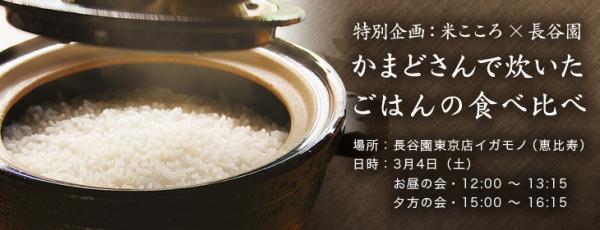 米穀の製造加工および販売を手掛ける、株式会社むらせ(本社:神奈川県横須賀市米が浜通 1-6、代表取締役:村瀬 慶太郎)が運営する“むらせライスの公式通販 米こころ”は、2017 年 3 月 4 日(土)に「伊賀焼窯元 長谷園 東京店イガモノ」にて、長谷園 炊飯土鍋”かまどさん”とのコラボ企画『かまどさんで炊いたごはんの食べ比べワークショップ』を開催します。