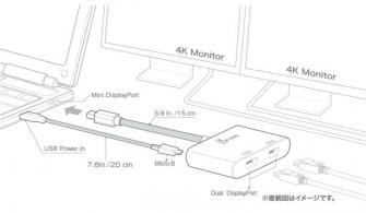 タ(タブレット、ノート、デスクトップ)に2台のモニタを同時接続、最大4Kの超高画質で独立DUAL表示ができるデ