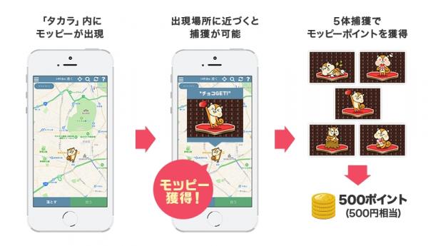 「モッピーGO」では、IndieSquareが提供する「タカラ」アプリに「IndieSquare Wallet」を同期させ、「タカラ」上の地図からモッピートークンの取得をおこないます。モッピーユーザーは、2月10日から渋谷・新宿駅周辺でばらまかれるモッピー(トークン)を「タカラ」アプリを使い出現場所で捕まえて、5種類のモッピー(トークン)を集めると、最大1,000円分のモッピーポイントを獲得できます。