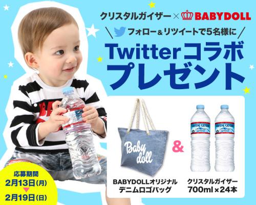 2月13日(月)~2月19日(日)の期間中にBABYDOLL、クリスタルガイザー公式Twitter両アカウントをフォロー&キャンペーンツイートをRTで、抽選で5名様にBABYDOLLオリジナルデニムバッグ&クリスタルガイザー700ml×24本をプレゼント!