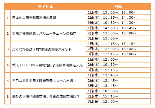 今回、弊社ブース(東7ホール:E7-20)では、今後の太陽光発電事業展開に役立つプレゼンテーションを無料で実施致します(各回15分程度を予定しております。事前予約は不要ですがお席には限りがあります)。また弊社ブース内において弊社が発行する各種資料もご覧頂けます。