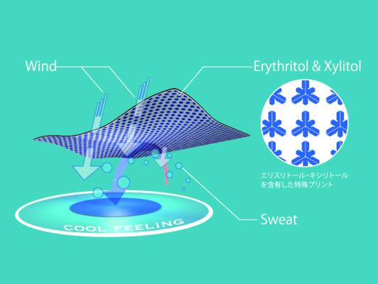 一般的な水分を気化させることで皮膚の温度を下 げるものとは違い、特殊プリントで処理した繊維が人の皮膚から発生する水分(汗)を吸収すると、その吸熱特性により繊 維自体の温度が下がり、冷感を付与します。