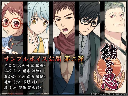 現在、事前登録を受け付けしている新作カード式シナリオゲーム『結ひの忍』にて、登場キャラクターの中から、「すじこ」「玉子」「おかか」「昆布」「梅」のサンプルボイスを公式サイトにて公開しました。