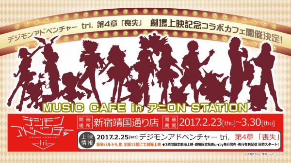 株式会社ナムコは、作品が持つ世界観の中で、飲食や映像音楽を通じて、ファン同士が一体感を共有できるエンターテインメント施設『アニON STATION 新宿靖国通り店』(東京都新宿区)で、2017年2月23日(木)~3月30日(木)の期間、デジモンアドベンチャー tri. 第4章 「喪失」(※1)の劇場上映を記念して、『「デジモンアドベンチャー tri.」MUSIC CAFE in アニON STATION』を開催いたします(フリー入場/ワンオーダー制)。