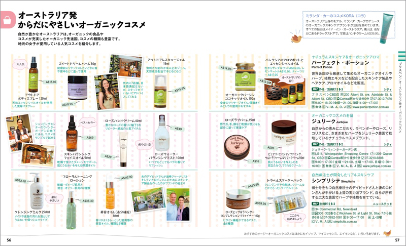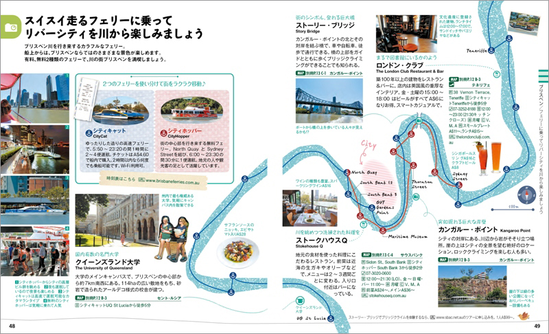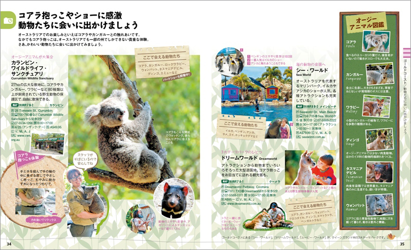 それぞれのエリアの主な掲載内容として、ゴールドコーストではビーチ、レストラン、カフェ、ショッピング、ブリスベンではフェリーでの観光、ディナー、カフェ、コスメに世界最大のコアラ保護区など、ケアンズは市内観光に加え周囲の自然や世界遺産のデインツリー国立公園を掲載。グレートバリアリーフでは世界遺産のグリーン島ほか個性ある島々の楽しみ方を5つのパターンでご提案しています。