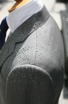 今回発売するスーツの表地には、近年注目されている、生態の持つ優れた機能や形状を模倣するバイオミメティクス(生物模倣)を用いて東亜紡織株式会社が開発した撥水加工の「AQUA(アクア)FLOW(フロー)」を施しています。この加工はハスの葉の撥水構造を取り入れているのが特徴です。