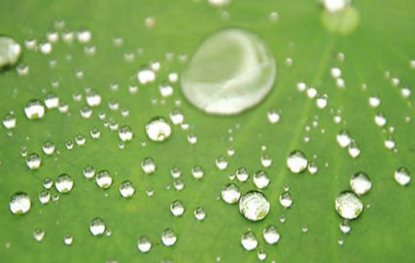 ハスの葉の表面には非常に細かい 凹凸が無数にあり、ワックスのような物質がその凹凸を覆うことにより水玉が潰れるのを防ぐ役割を果たしています。この構造を応用し、ウール表面の微細な凹凸に特殊な撥水剤を付着することで優れた撥水性を発揮します。この撥水剤はウール繊維間を接着せず、表面に樹脂皮膜を作らないため風合いを損なわずにウール本来の柔らかさを保ちます。