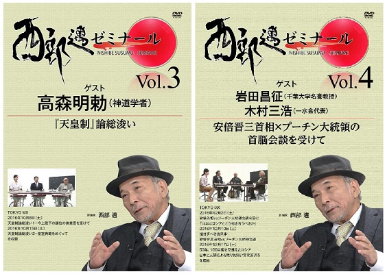 ゴマブックス株式会社(所在地:東京都港区、代表取締役社長:赤井仁)は、2017年2月17日(金)より、Amazon DOD(ディスク・オン・デマンド)ストアにて、DVD『西部邁ゼミナール』「Vol.3【ゲスト:高森明勅】『天皇制』論総浚い」、「Vol.4【ゲスト:岩田昌征、木村三浩】安倍晋三首相×プーチン大統領の首脳会談を受けて」の販売を開始いたしました。