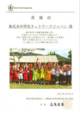 個別指導塾「明光義塾」を全国展開する株式会社明光ネットワークジャパン(本社:東京都新宿区、代表取締役社長:田上節朗)は、2017年2月16日(木)、国連WFP「学校給食プログラム」に対する支援について、国連WFP協会より感謝状を授与されました。
