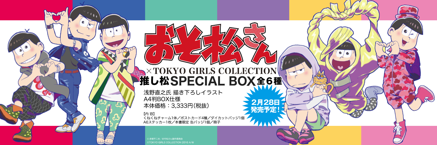 辰巳出版株式会社(東京都新宿区、代表取締役社長:廣瀬 和二、以下辰巳出版)は、 2017年 2月 28日(火)に発売になる、大人気アニメ「おそ松さん」と、女性に大人気のファッションイベント「TOKYO GIRLS COLLECTION」のコラボを題材とした「おそ松さん×TOKYO GIRLS COLLECTION 推し松 SPECIAL BOX」の公式サイトを本日2月21日(火)にオープンいたします。
