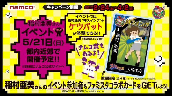 キャンペーンでは対象機に500円投入ごとにスクラッチカードをお渡しします。カードをスクラッチしていただき、その場で抽選結果に応じた賞品を差し上げます。神スイングで話題の「稲村亜美さんのケツバットが体験できるイベントに参加できる権利(当選者専用はがき)」※1を450本の他、稲村亜美×ファミスタ30周年記念コラボカード(全4種・トレーディングカードサイズ)、ナムコ賞(お店ごとに異なります)が当たります。
