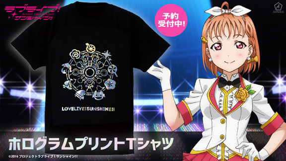 TVアニメ13話の「MIRAI TICKET」のステージデザインを中心に、Aqours9人のそれぞれのモチーフをホログラムプリントした特別感あふれるTシャツです。