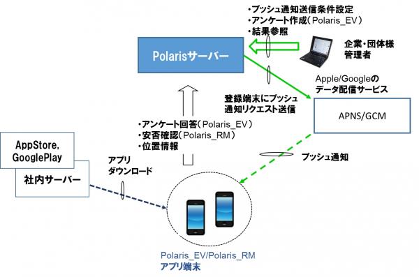 Polaris_EVとPolaris_RMは、当社と株式会社シンクワン(代表取締役:阿部泰男、本社:東京都墨田区 両国4-38-1、以下シンクワン社)、データアクセス株式会社(代表取締役:香西省治、本社:豊島区東池袋 1-47-3、以下データアクセス社)が共同開発した、スマホにプッシュ通知で情報を発信するサービス・ソフトウェアPolaris製品です。