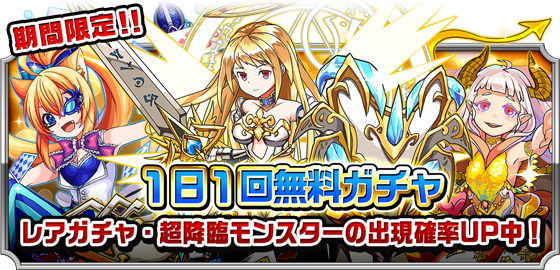 キャンペーン期間中は、「1日1回無料ガチャ」で、レアガチャ・超降臨モンスターが出現する確率が大幅にアップします!