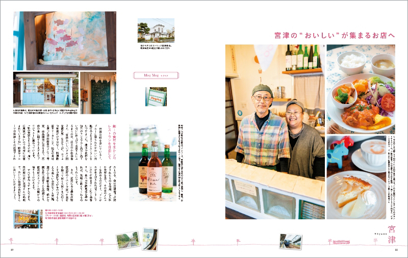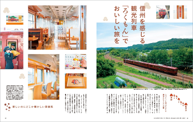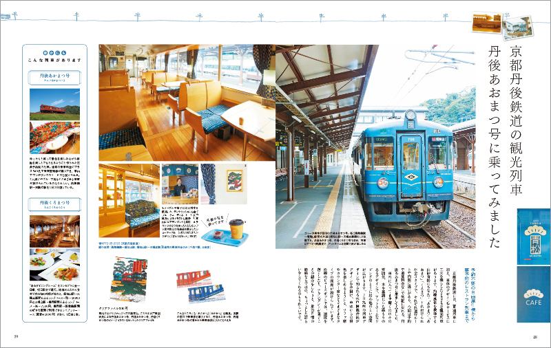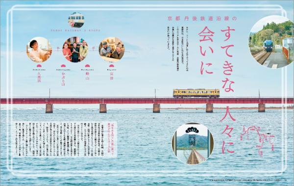 巻頭特集は「京都丹後鉄道沿線のすてきな人々にあいに」。のんびりローカル線に揺られながら、この地に住む素敵な人々との交流を通じて、天橋立に代表される美しい自然景観や町家、絹織物やちりめんなど伝統産業に触れ、新鮮な海の幸とこの地に伝わる醸造文化を味わう旅をご紹介しています。