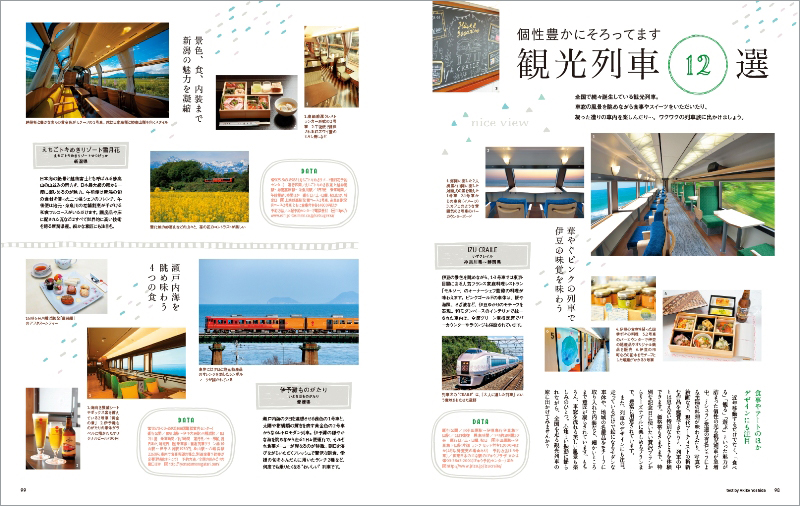 このほかにも、「観光列車12選」、「東急大井町線に乗ってスイーツさんぽ」、嵯峨野観光鉄道の運転士の方へのインタビュー記事「笑顔を運ぶトロッコ列車の魅力」、「路面電車の走るまち」など、ことりっぷの視点で切り取った鉄道旅行尽くしの一冊です。