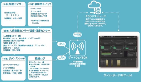 「センサー6種(各1個)+ゲートウェイ+クラウドストレージ+ダッシュボード(BIツール)」がオールインワンの3か月間お試し価格198,000円から利用可能。