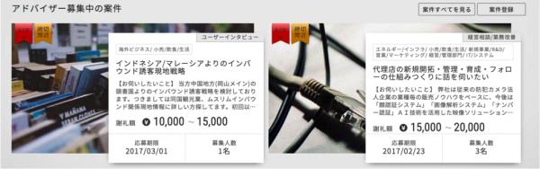 事業概要:「世界中の知見をつなぐ」をビジョンに掲げ、ビジネス相談ニーズに対し個人が1 時間から対面や電話で相談に応えるスポットコンサルティングプラットフォームを運営。現役の役職員を中心に、企業 OB、フリーコンサルタントなど30,000 名が登録。組織、地域、世代を超えて、個人の知見を活かしビジネス課題を解決する、知見分野のシェアリングエコノミーを推進。