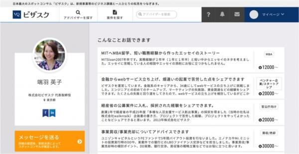 ■個人はアドバイザーとして活躍するため、経験分野やプロフィールを登録します。アドバイザー登録は無料、マッチングした場合、謝礼の70%が銀行口座に振り込まれます(30%はシステム 利用料してビザスクが申し受けます)。アドバイザーが務める企業の社内規定などアドバイス料を受け取れない場合は、ビザスクが提携するNPO 法人(Teach for Japan、国連 WFP 協会およびブリッジ・フォー・ス マイル)に寄付することもできます