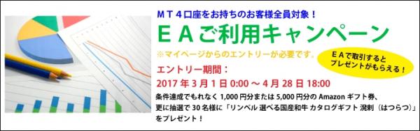 FX取引サービス「MT4・ZERO」を提供する外為ファイネスト株式会社(本社:東京都千代田区、代表取締役:石野由美子)は、2017年3月1日より、EAでの取引量に応じて「Amazonギフト券」や、エントリーされた全てのお客様の中から抽選で30名様に「リンベル 選べる国産和牛 カタログギフト 溌剌(はつらつ)」をプレゼントする「EAご利用キャンペーン」を開催中。
