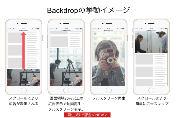 今回の新しい課金プランでは、縦型フルスクリーン動画広告フォーマット「Backdrop(バックドロップ)」がプラウザ内で80%以上の領域が表示された状態で3秒以上再生された場合のみ広告費用が発生します。視聴者のスクロール挙動により、広告ユニットのわずか20%でもブラウザで表示されなくなれば再生が停止されるため、広告へ興味のないユーザーの視聴が視聴時間として計測されるリスクは殆どありません。