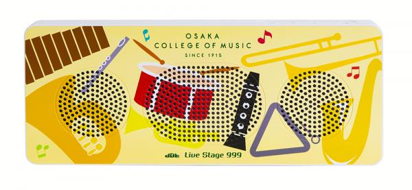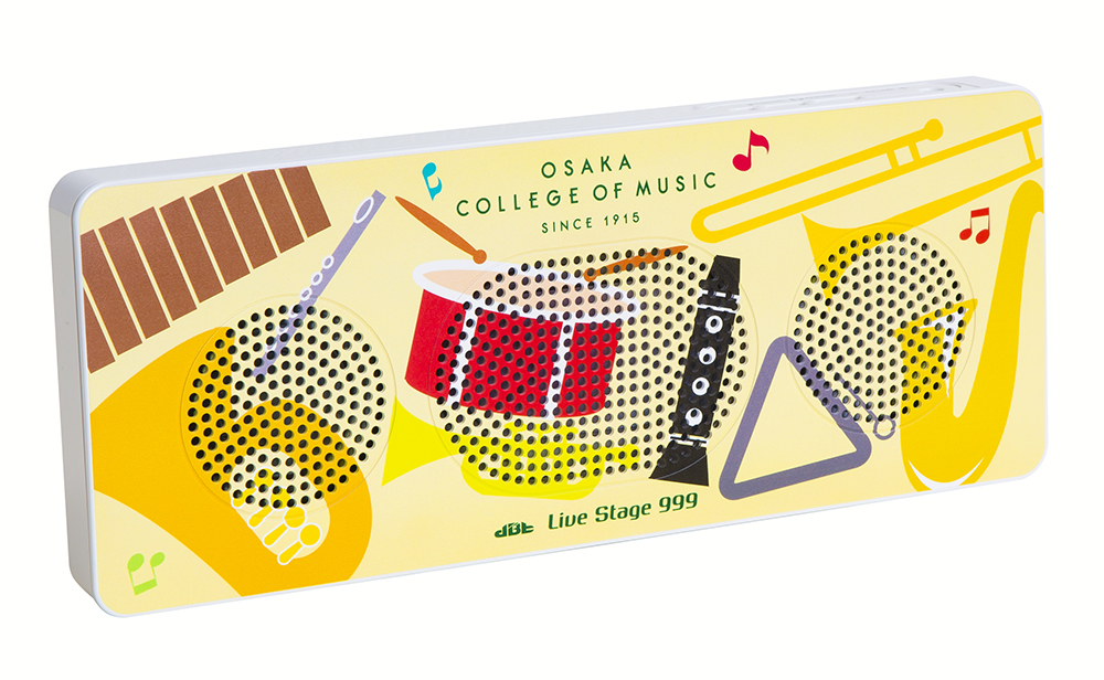 本商品は、Bluetoothスピーカー「Live Stage 999」に大阪音楽大学によるオリジナルデザインを採用しております。今回のデザインは、吹奏楽の楽器をイメージしております。