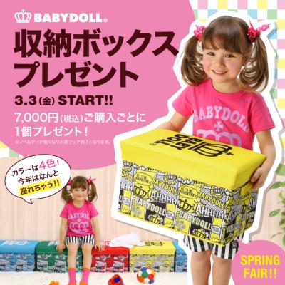 株式会社コージィコーポレーションが運営するベビー・キッズ服ブランドBABYDOLL(ベビードール)が、7,000円(税込)以上お買い上げごとにオリジナル『座れる収納BOX』をプレゼントする<ノベルティキャンペーン>を3月3日(金)から開催します。