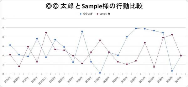 人間の行動は、目の前の出来事に対して脳で「思考」や「感情」で判別され「行動」として現れます。BRAINでは、その人物がよくとる行動・あまりとらない行動の行動特性20項目を数値として表すことができます。