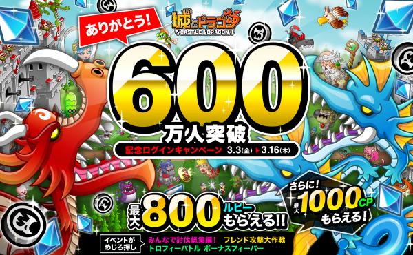 3月3日(金)より、『城とドラゴン』の登録ユーザー数が600万人を突破したことを記念して、