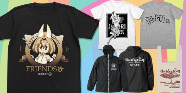 フレンズたちの為の「けものフレンズTシャツ」や、サーバルキャットの“サーバルちゃん”がジャンプしている所や“コツメカワウソ”が遊んでいる所がデザインされたTシャツをはじめ、「ジャパリパーク フーデッドウインドブレーカー」「ジャパリパークお土産エコバック」といった作品・登場キャラクター達をより身近に感じられるアイテムが多数ラインナップ致しました。