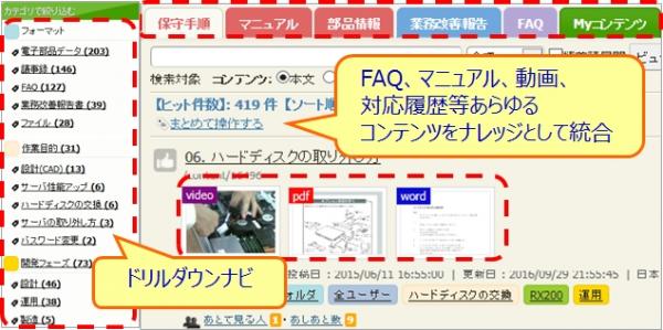 FAQやマニュアル、取扱説明書、操作動画、過去の対応履歴、熟練者が持つノウハウ等、業務の問題解決に有効なあらゆる情報を統合し、一元的に管理します。これらの情報をタグとドリルダウンナビで整理することにより、どこに何があるか知らないと探せないフォルダ管理と異なり、製品や症状、やりたいことなど、カテゴリから項目を絞り込み、それぞれの業務にあった切り口で効率的に必要な情報にアクセス可能です。