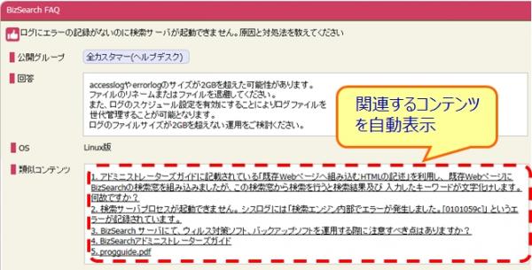 さらに今回の強化でおすすめコンテンツの自動掲示機能を搭載し、関連情報へのより簡単なアクセスを実現しました。BizAntenna QAメーカーでは、FAQ、保守マニュアル、お客様対応履歴など問題解決に必要なコンテンツを統合しているため、たとえばFAQを参照した際に関連するマニュアルページや過去のインシデント履歴が表示されるなど、関連するナレッジを最大限に活用した問題解決が可能です。