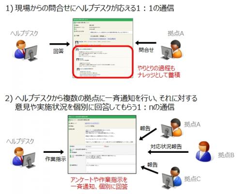 2)ヘルプデスクから複数の拠点に一斉通知を行い、それに対する意見や実施状況を個別に回答してもらう1:nの通信