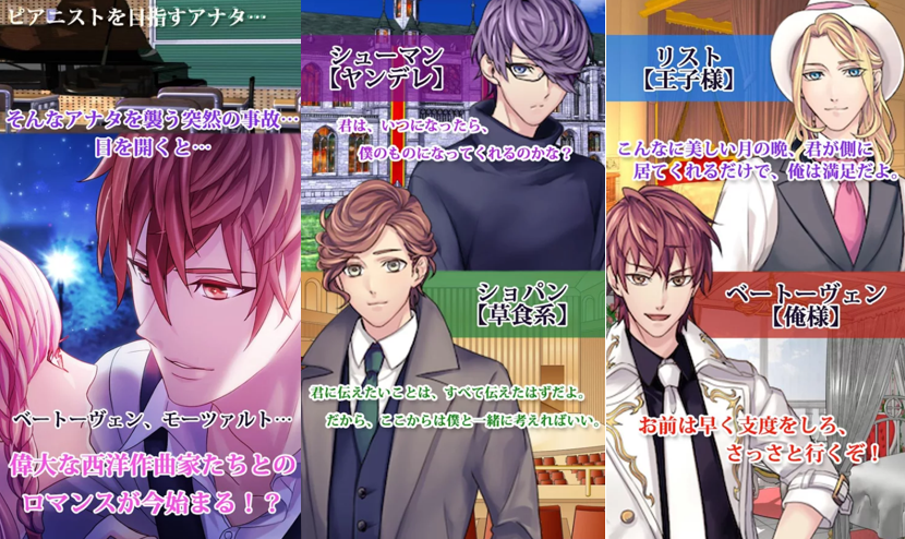 本アプリは、有名な海外音楽家たちとの恋愛を体験できる女性向け「恋愛アップドラマ」です。