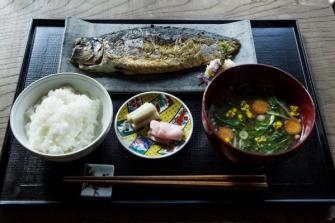 また、『もの凄い鯖』と併せるお米は、昭和2年から地元・大森で米屋を営む「鈴木商店」からその時期によって、『もの凄い鯖』に合うお米を選別して提供します。その他の味噌汁や付け合せの漬物もすべては『もの凄い鯖』を美味しく食べる為に試行錯誤の末に作られました。茶碗や小鉢、箸置き、湯呑みには九谷焼を使用します。